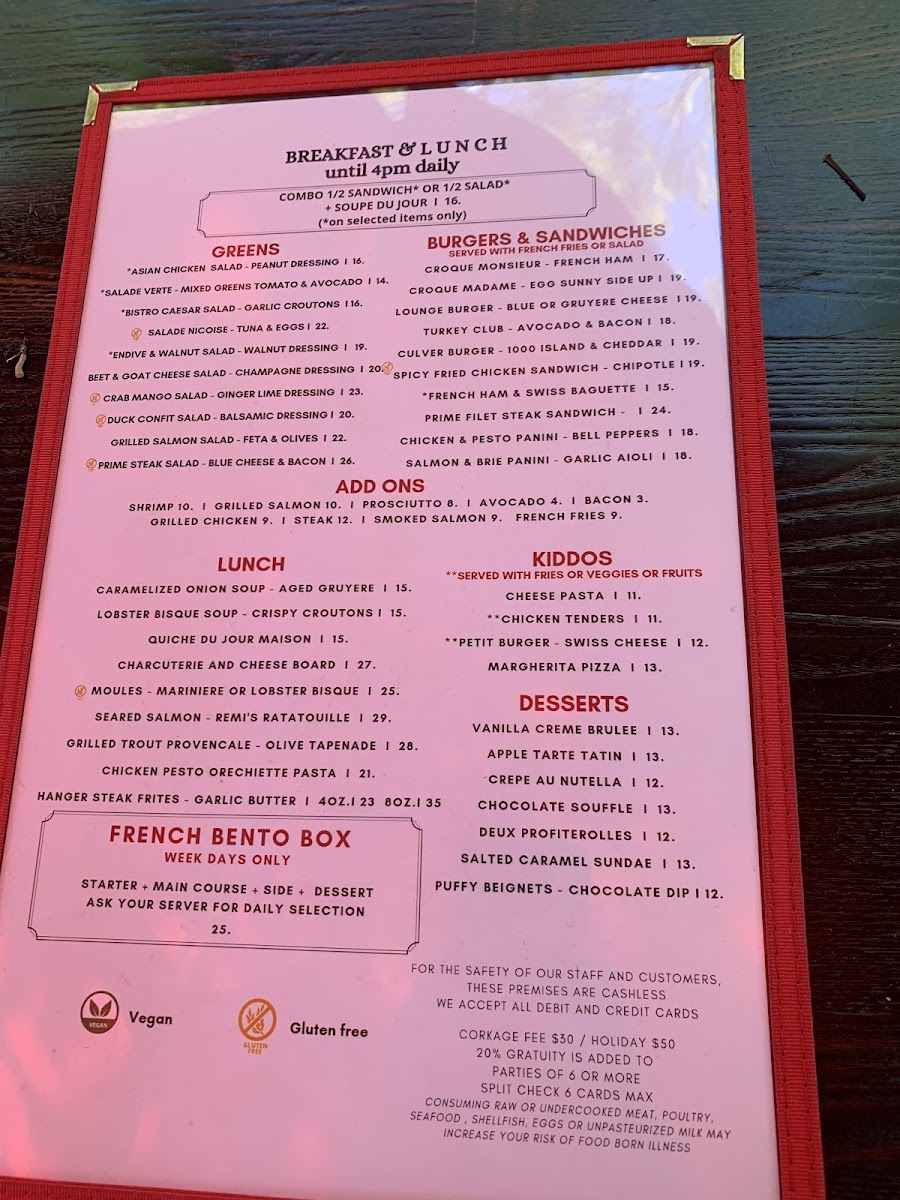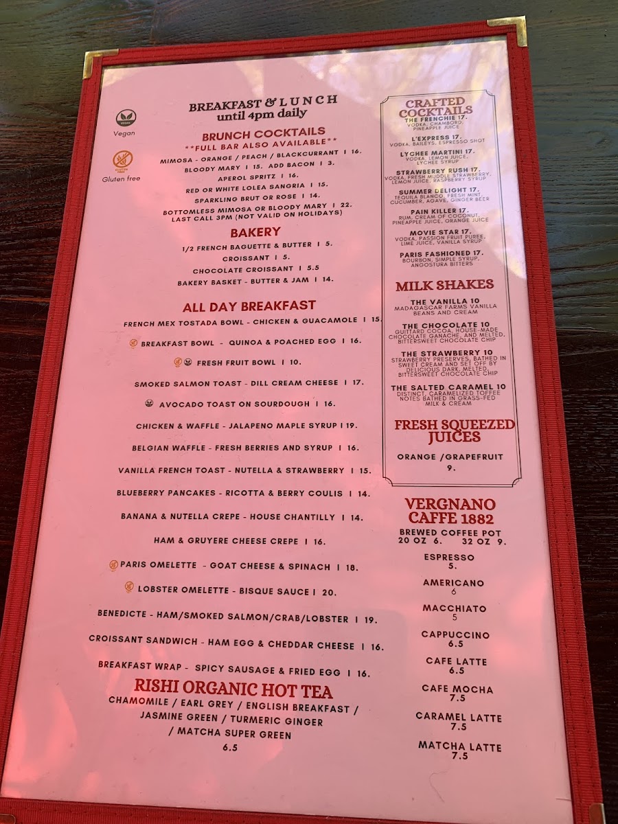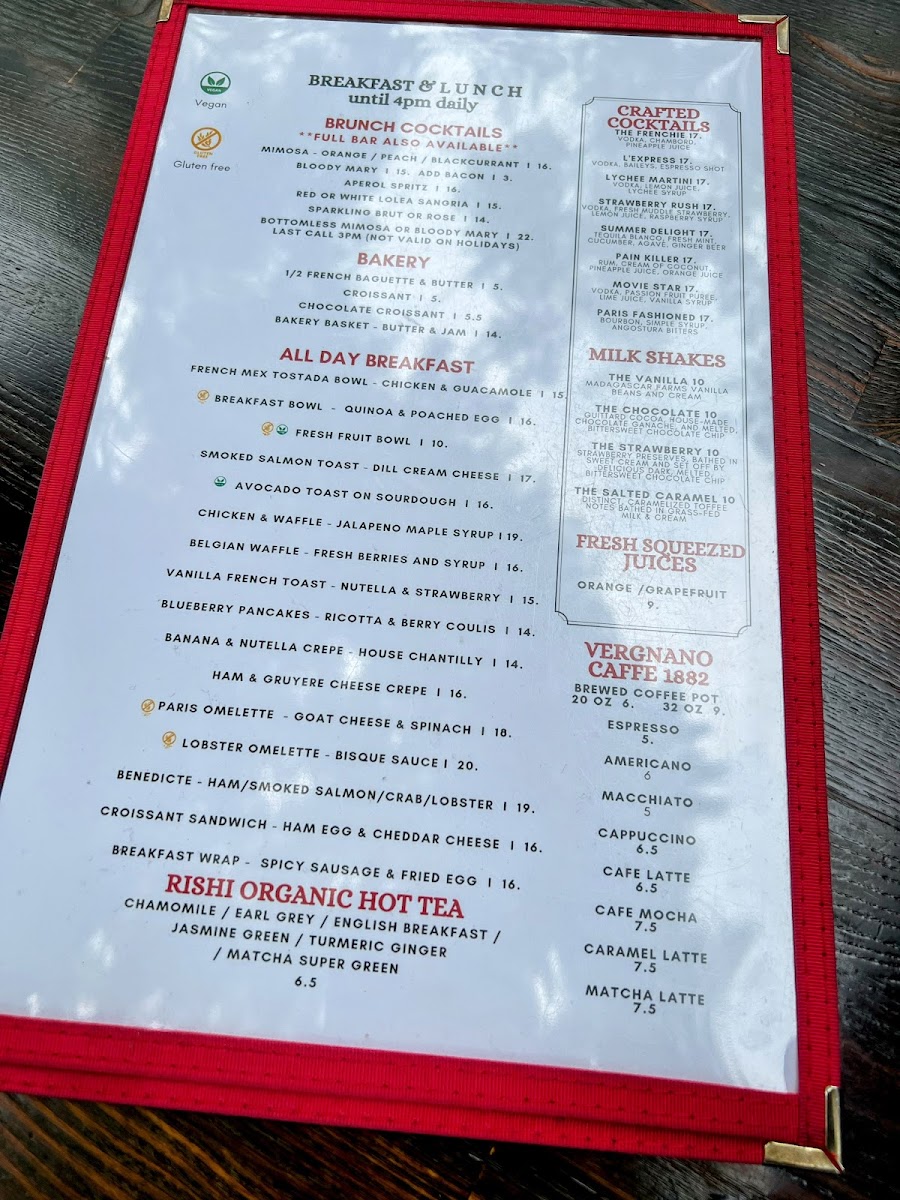 The menu features a variety of French bistro classics alongside select international influences, offering options suitable for breakfast, lunch, and dinner. It is organized into categories including starters, main courses, and beverages, providing a balanced selection of savory dishes, light bites, and drinks.