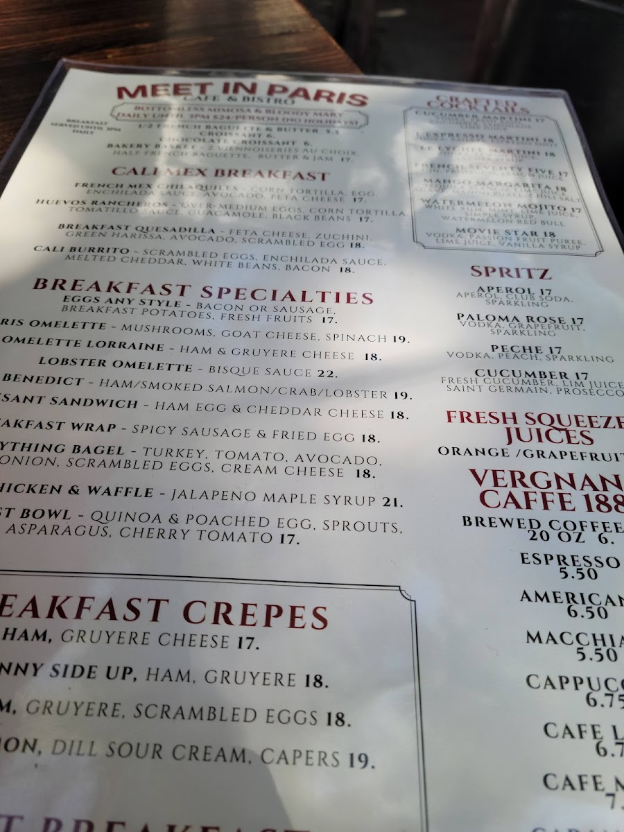 - Breakfast Selections: Items labeled as Callmex Breakfast include French Mex Chilaquiles, Huevos Rancheros, Breakfast Quesadilla, and Cali Burrito, reflecting a blend of French and southwest breakfast influences.